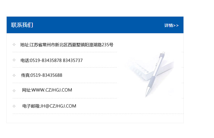 傳真:0519-83435688    郵編:213135    網址:WWW.czjhgj_com.jypem.com    電子郵箱:JH@czjhgj_com.jypem.com
